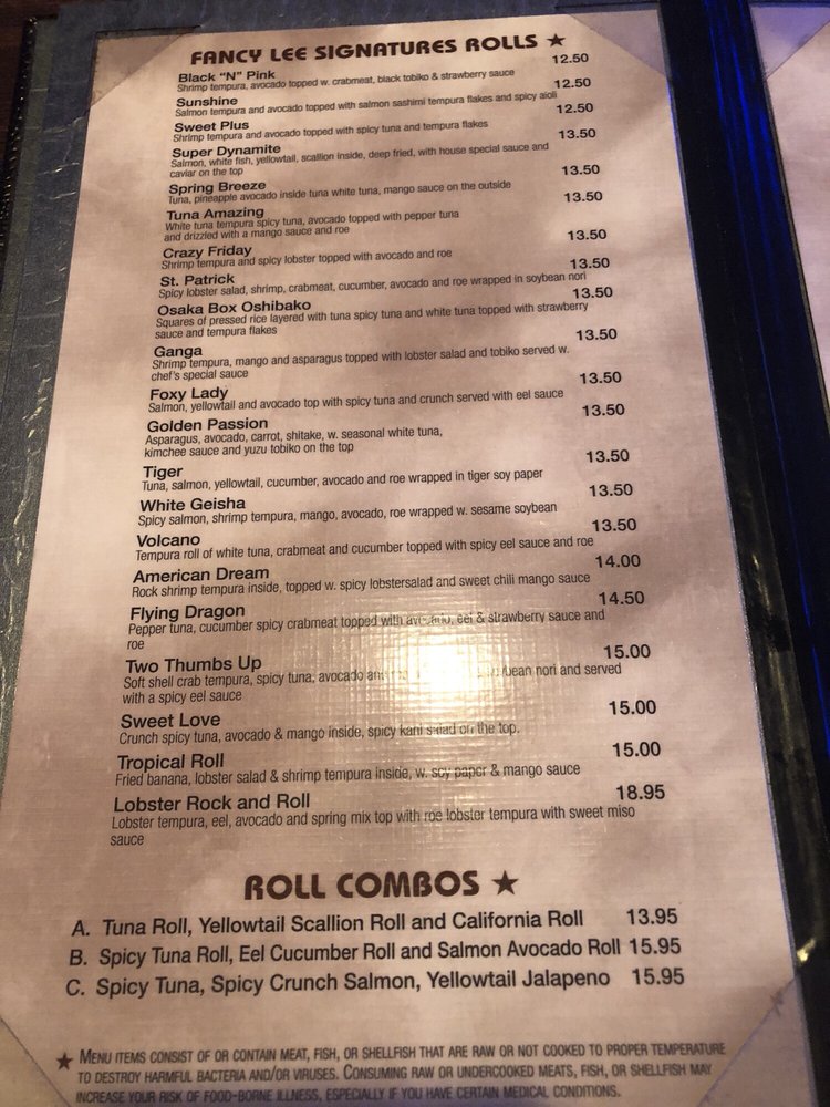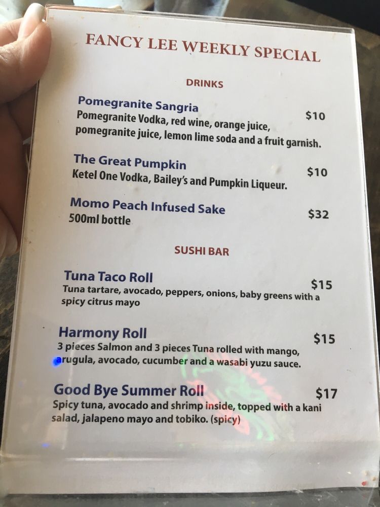 Introducing the menu at Fancy Lee, located in Babylon, NY, offering a variety of dining experiences. From hot appetizers like the Fancy Lee App Kani to cold appetizers like Pan Seared Shimichi White Tuna, the menu boasts innovative dishes that satisfy diverse palates. Customer favorites like the Fancy Lee roll and sushi options receive high praise, showcasing the restaurant's commitment to quality and flavor. The cozy ambience, friendly staff, and efficient service add to the overall dining experience. Whether you're craving sushi, hibachi, or traditional Chinese dishes, Fancy Lee has something for everyone. Don't miss out on their signature cocktails and tempting dessert options to round off your meal. Visit Fancy Lee for a delightful dining experience that combines exceptional food, ambiance, and service.